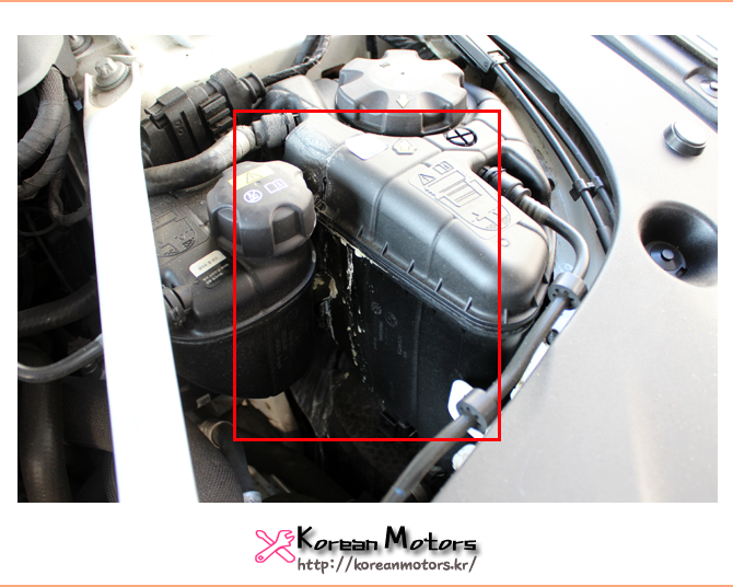 누수된 냉각수가 보조탱크 주변으로 흔적을 남겼네요