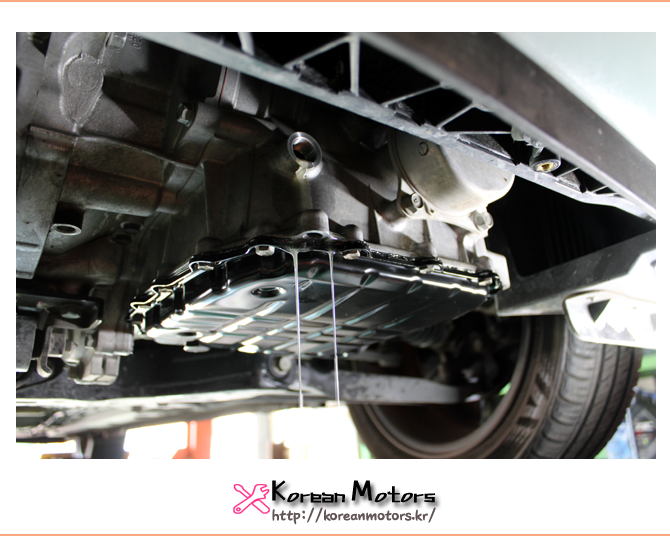 내부의 잔유를 모두 배출한 뒤 미션오일팬을 탈거해주었습니다